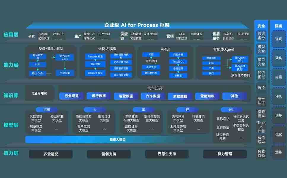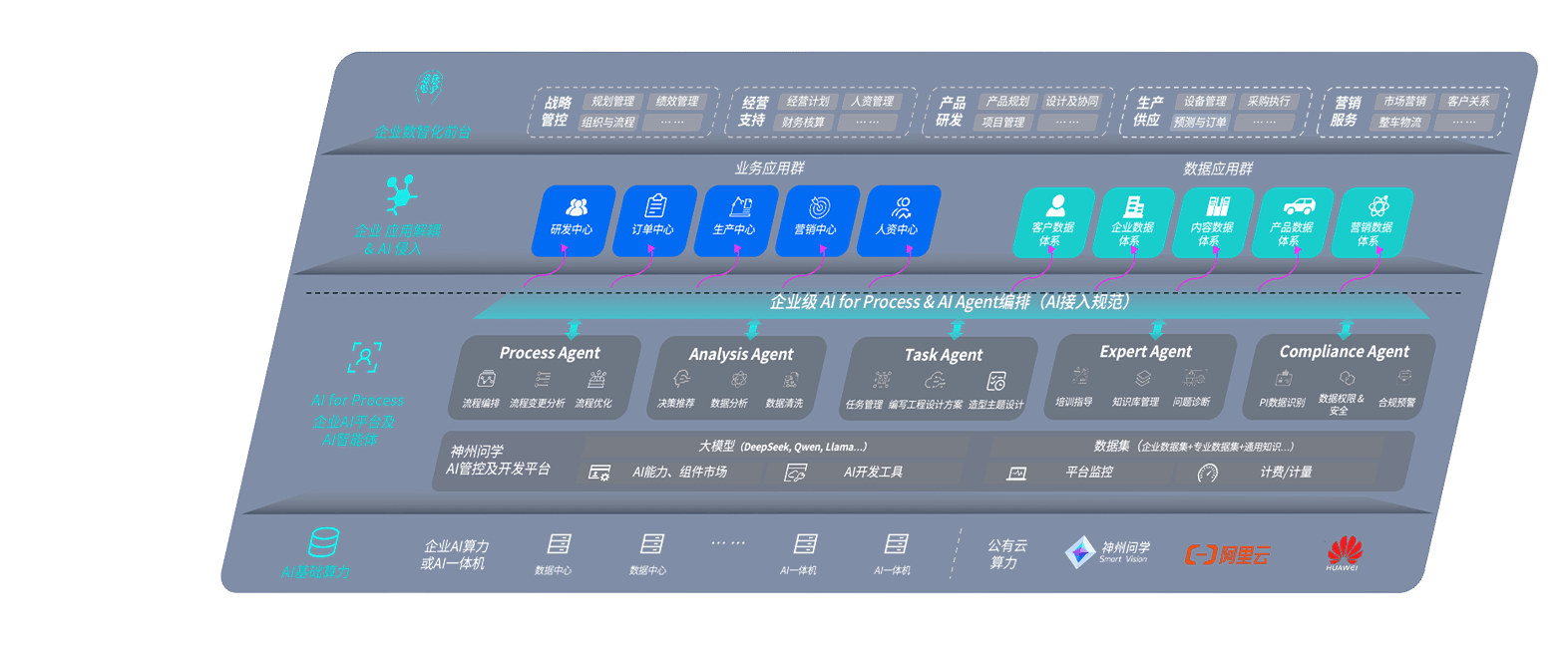 端到端的一站式AI工作空间深度融合了从企业战略规划到日常经营的全流程业务板块,,定向解决车企内部领域多、、部门多、、、、链条长、、、场景碎片化等难题,,,支持车企快速构建以AI为核心的生产力写作体系,,实现任务执行与AI能力的无缝集成与交互