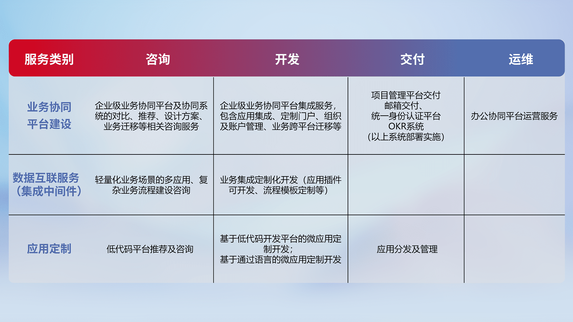 针对钉钉、、企微、、、IDaas等平台级产品提供产品的规划、、方案、、交付、、、定制化开发等服务,,,,实现如统一协同办公、、、、智能客户服务、、混合会议管理、、、智能数据查询、、等业务场景,,实现数字化转型。。。
