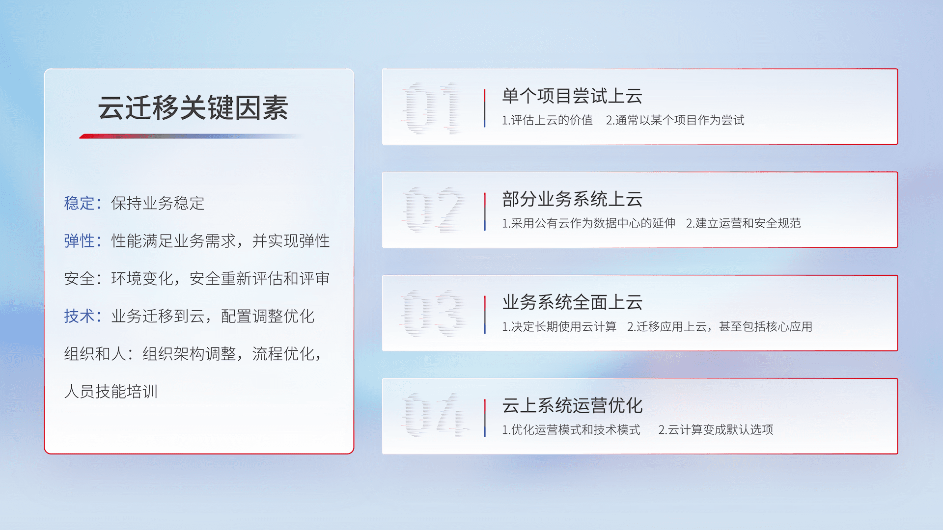结合实际业务,,,从规划设计、、云平台选型、、、云原生改造、、数据迁移、、、、集成交付,,迁移全过程为客户识别最佳上云路径,,做好风险识别管理,,设计网络架构、、、、身份权限、、安全审计合规、、操作审计、、、、日志审计、、、、监控告警策略、、多站点容灾设计等,,,对云上基础设施进行整体规划,,,提升IT治理水平,,,,以满足弹性、、、、高可用、、、高性能的需求。。