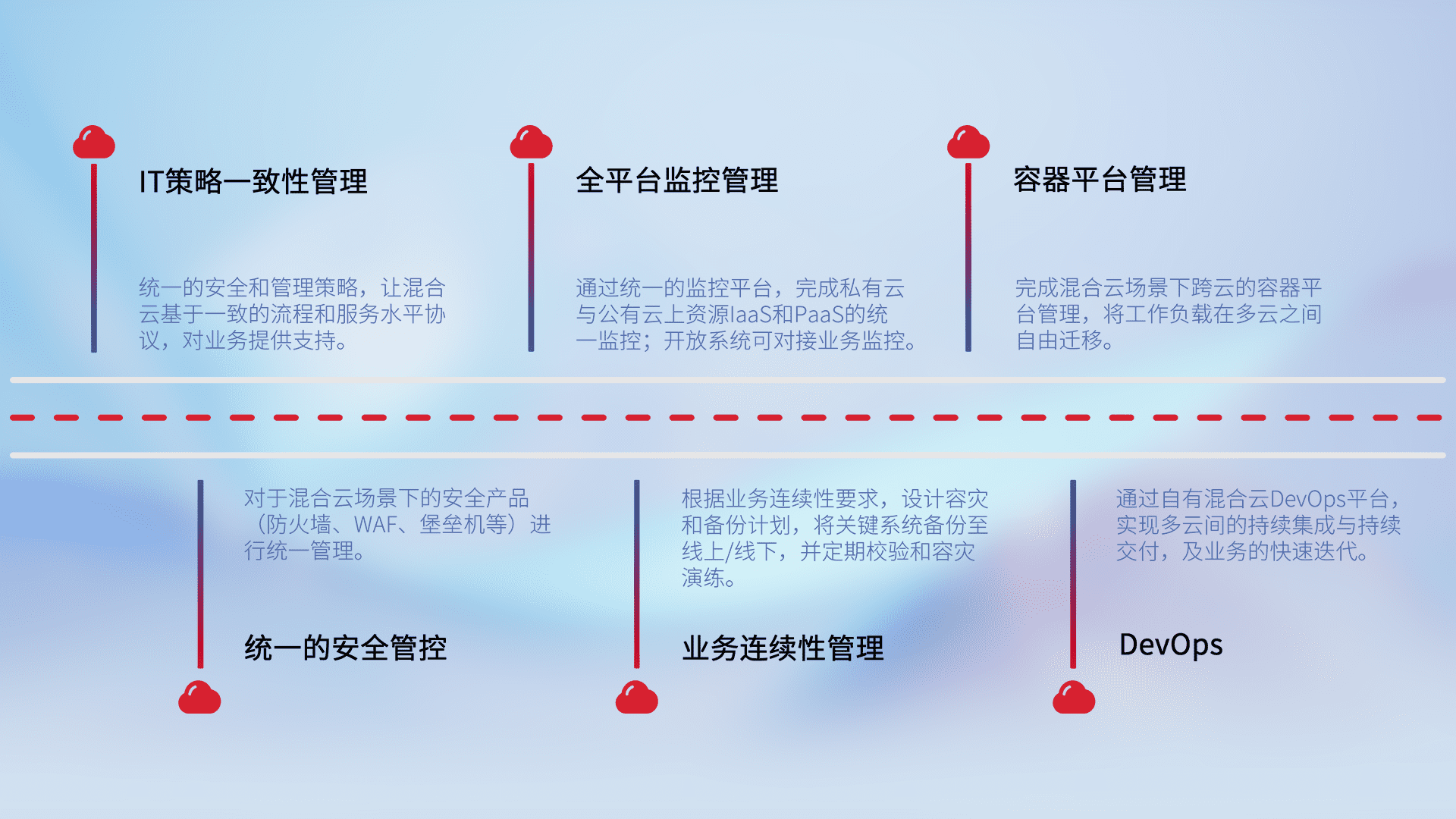 通过多云纳管,,,以统一的资源数据模型把客户的云资源进行抽象和封装,,,,进而实现对多云资源的统一操作,,,保障云资源管理的可靠性、、、、稳定性与可用性。。。量身定制化运维内容,,,配置、、开发运维、、补丁管理、、、备份、、监控、、认证和访问管理、、、审计和日常巡检等,,,保障在用云过程中的可靠度,,,稳定度以及高可用率。。