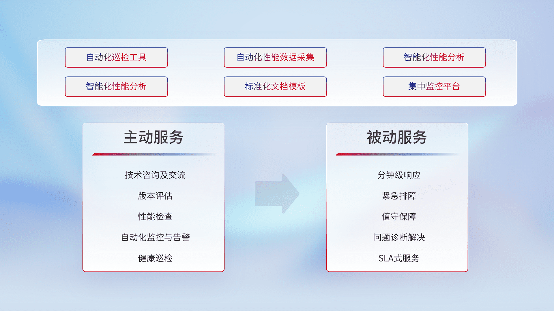 智能化工具和标准化文档,,保障服务质量,,,提供主动服务(包含技术咨询、、、、版本评估、、性能检查、、自动化监控与告警、、健康巡检)和被动服务包含(分钟级响应、、、紧急排障、、值守保障、、问题诊断解决、、、、SLA服务)。。。